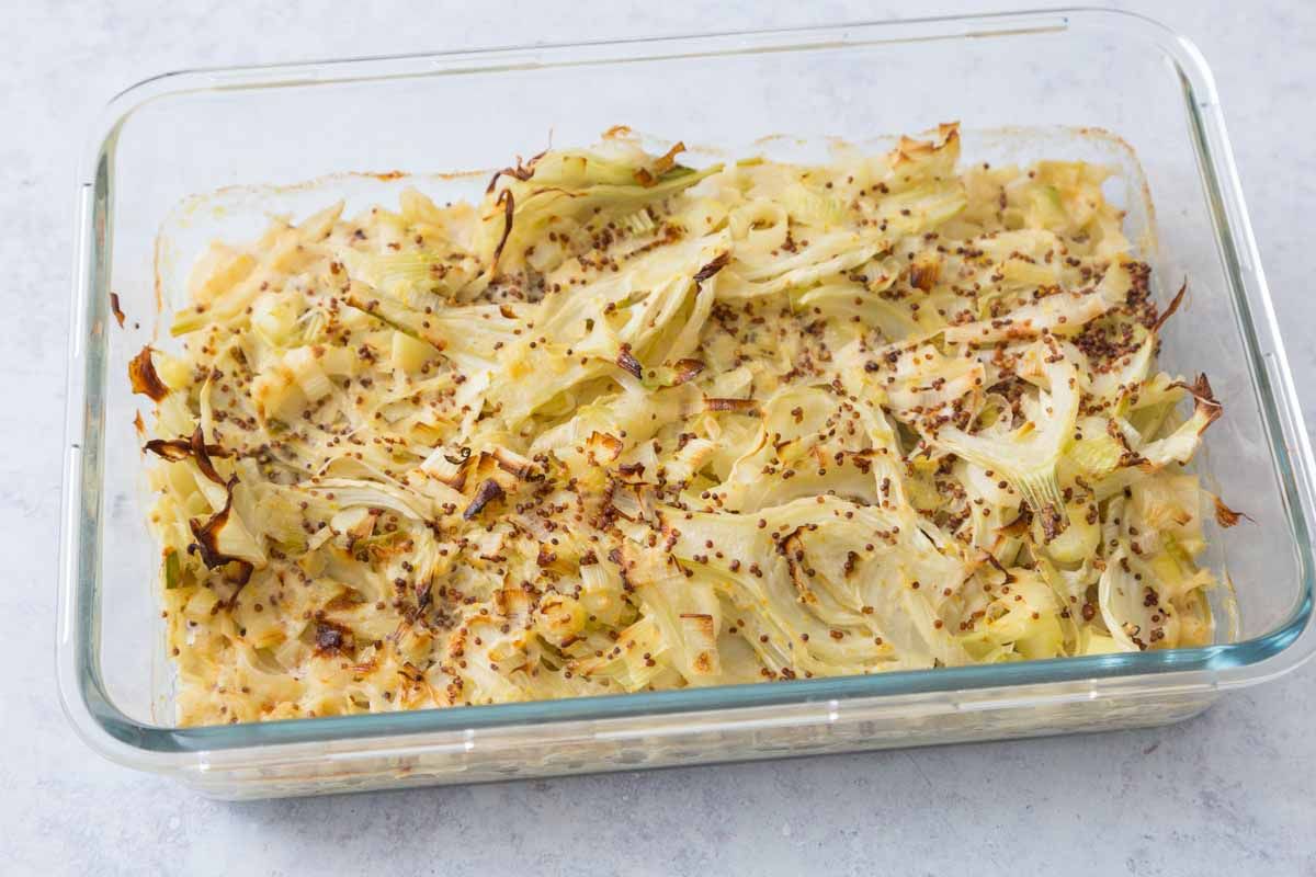 Ce gratin délicieux et entièrement végan associe le goût anisé du fenouil aux poireaux tendres pour un plat réconfortant.