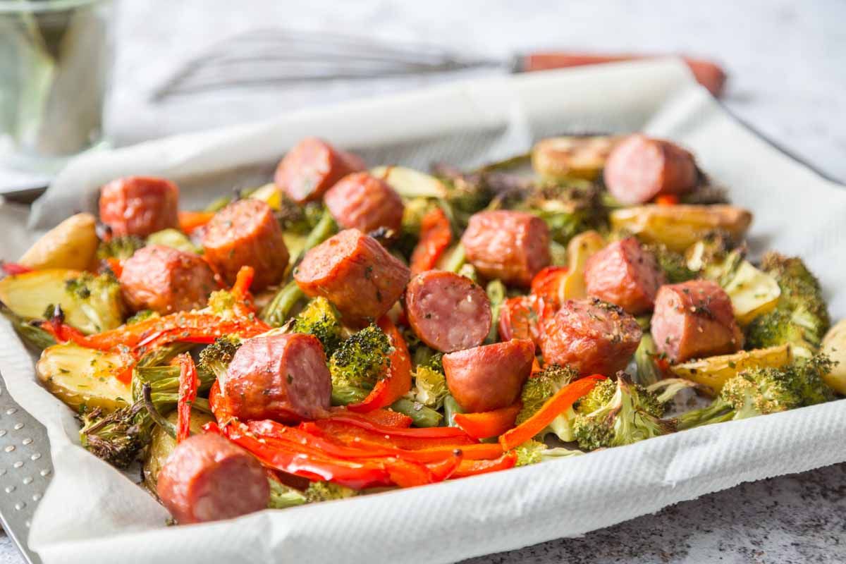 Avant, je préparais souvent des légumes au four, mais avec cette variante complète, je suis devenu accro ! Récemment, j'ai essayé des boulettes de boeuf caramélisées au four qui ont été un franc succès. Aujourd'hui, je vous propose une version estivale avec des saucisses. C'est l'idéal quand le barbecue est compromis et qu'il faut se réfugier à l'intérieur.