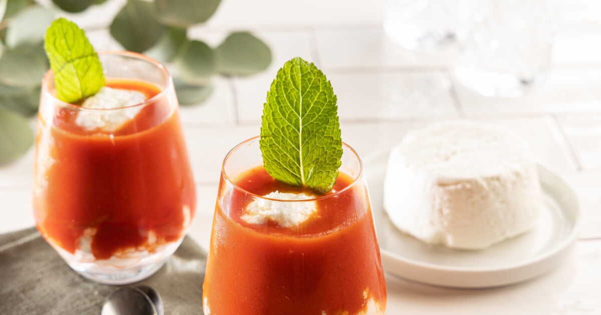 - Pour le dressage, déposez le Chèvre Frais au fond, ajoutez le gaspacho et terminez avec une quenelle de fromage frais.