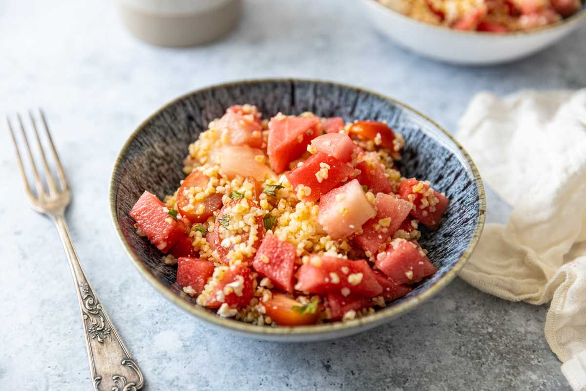 - Combinez le boulgour, la pastèque, les tomates cerise, la feta et la vinaigrette. Servez frais.