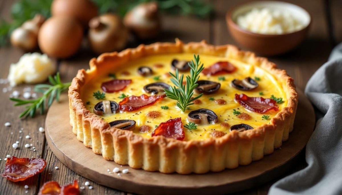 Cette quiche évoque les saveurs automnales avec des ingrédients comme les champignons qui apportent une texture et un goût umami qui complètent à merveille les lardons et le fromage.